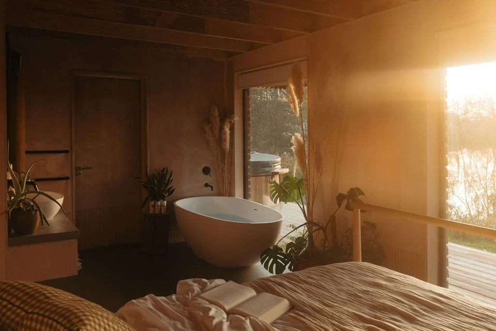 A romantic cabin for two with a private hot tub, sauna and lake views from the bath.